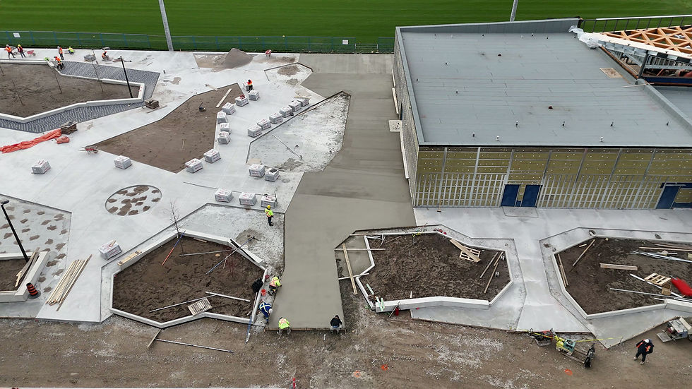Our scope of work includes the ongoing selection and installation of key site elements designed to enhance both functionality and aesthetics. Some of the work includes the construction of concrete barrier curbs, mountable and flush concrete curbs, and custom concrete seat walls, all carefully integrated into the overall landscape design. In addition, our team is completing comprehensive planting and landscaping, installing tactile paving to support accessibility, and coordinating bollard installation. We are still working away and completing each step. The project is expected to be completed by the Spring in 2026.